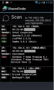 SharesFinder — утилита которая сканирует беспроводную сеть на наличие ресурсов с открытым доступом. SharesFinder ищет и находит HTTP, SMB и FTP ресурсы, просмотреть их можно тут же в программе.