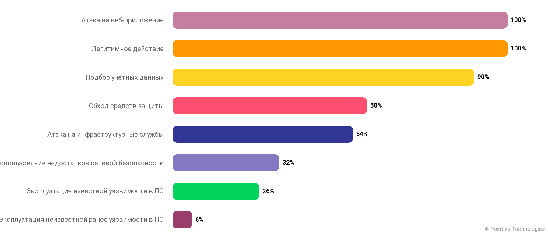 Среди всех векторов проникновения, в которых использовались уязвимости веб-приложений, 14% включали эксплуатацию уязвимостей нулевого дня. Всего при проведении внешнего пентеста было выявлено пять таких уязвимостей.