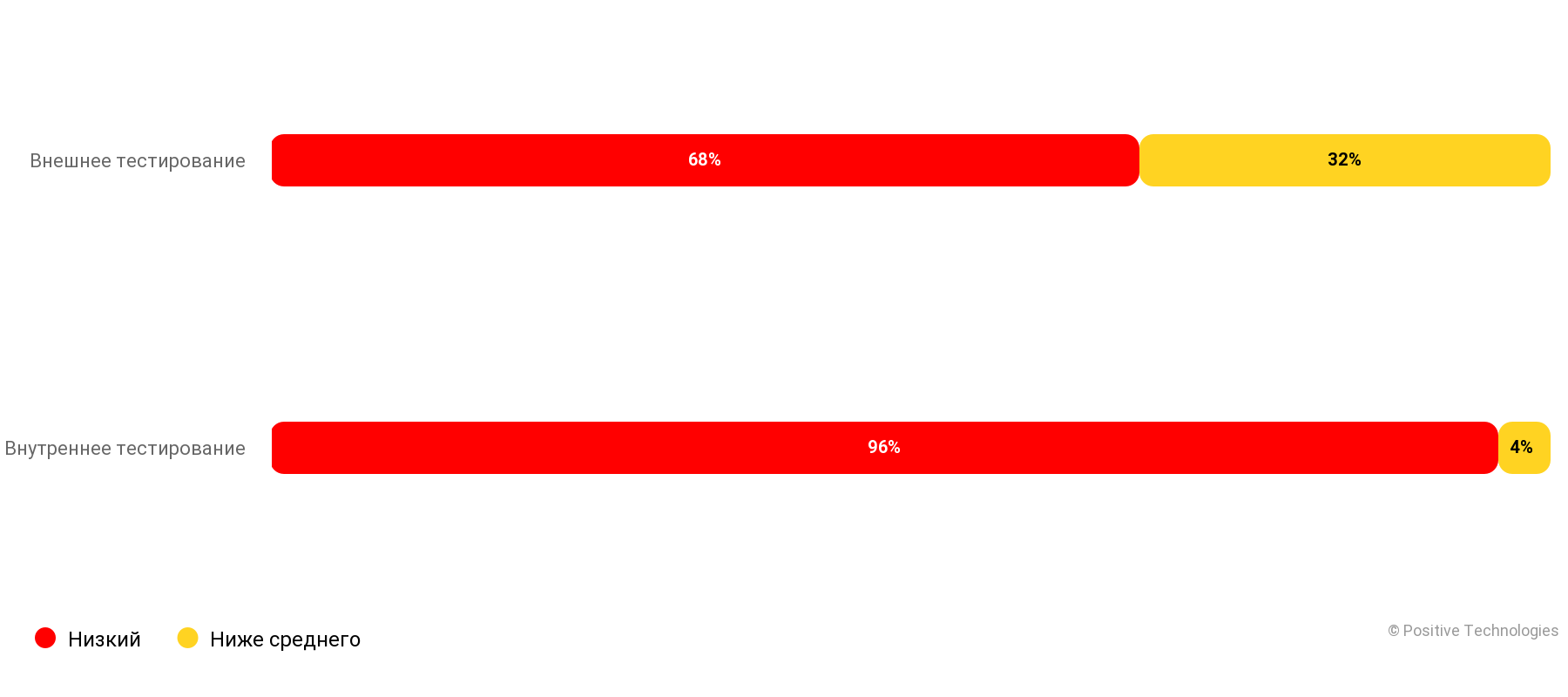При проведении внутреннего пентеста в 100% организаций была доказана возможность получить полный контроль над ресурсами домена, а получить доступ к конфиденциальной информации оказалось возможно в 68% компаний. В качестве конфиденциальной информации выступали, к примеру, персональные данные клиентов, базы данных компаний.