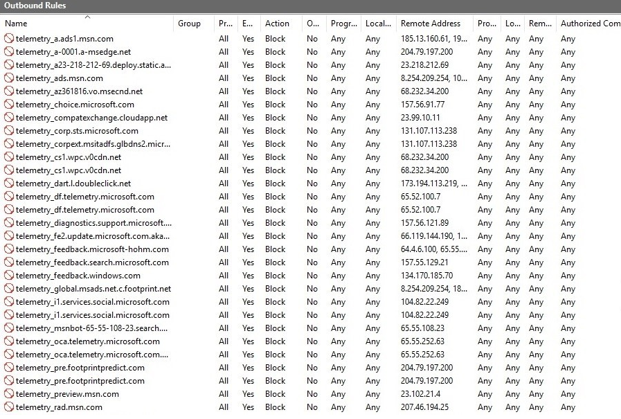 Я стал пробовать разнообразные варианты блокировки и отключения. Всё оказалось не так уж и сложно. Обычный, стандартный Firewall, отлично справился с данной задачей. В итоге я получил список всех адресов, куда происходила отправка данных с моей машины, не по моей воле!