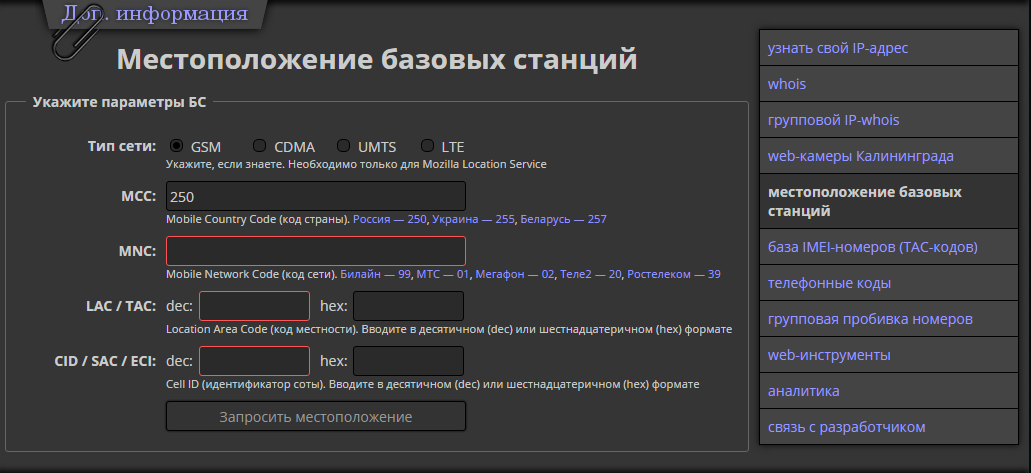 После того, как мы узнали LAC и Cell ID идем на http://xinit.ru/bs/.