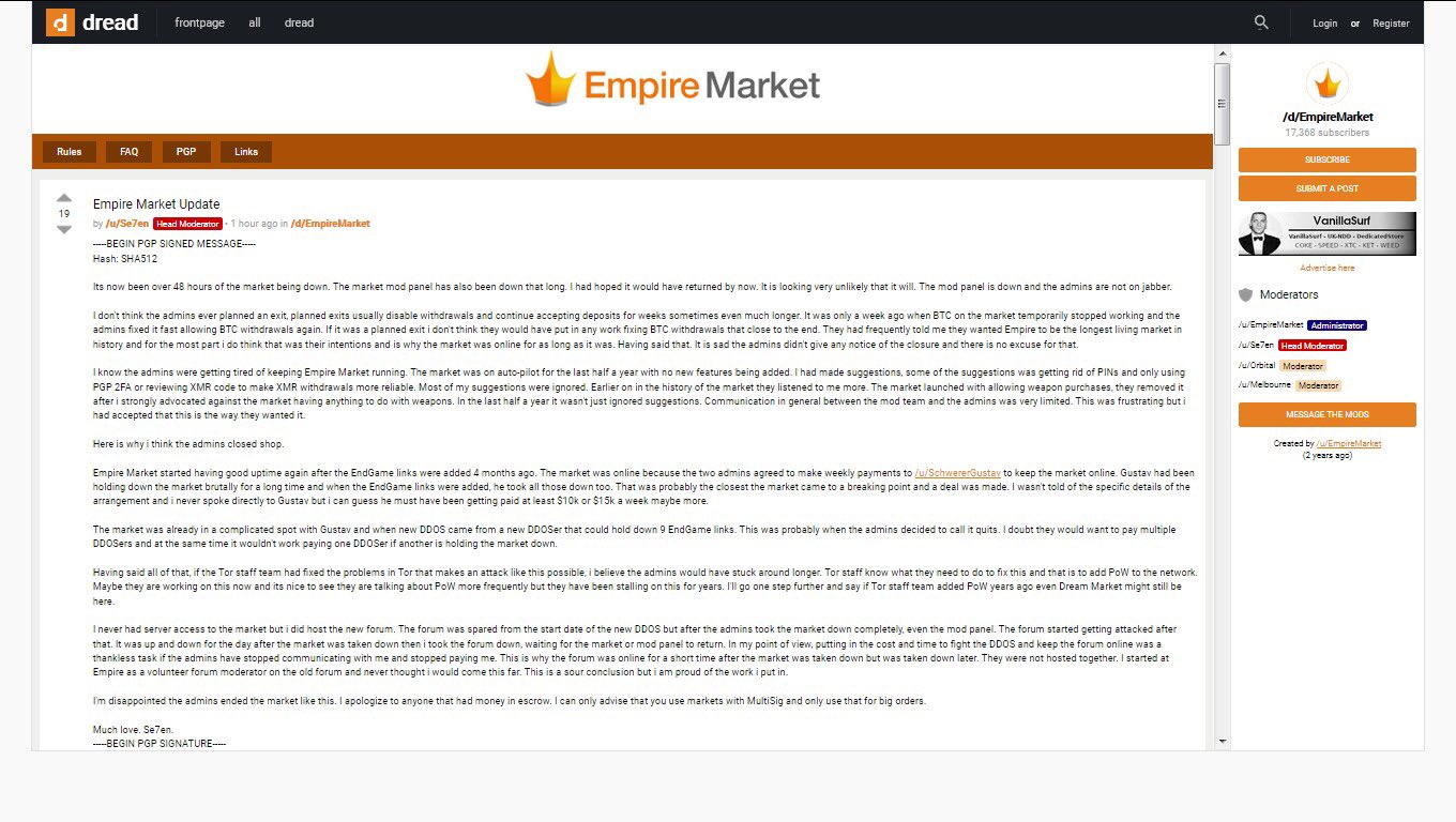 Все началось с того, что в прошлые выходные Empire ушел в оффлайн более чем на 48 часов, в чем встревоженные пользователи винили DDoS-атаку и подозревали exit scam. При этом главный модератор площадки, Se7en, выражал надежду, что администраторы в скором времени восстановят работу сайта, а некоторые пользователи сообщали, что даже смогли получить доступ к ресурсу, хотя и с большим трудом.