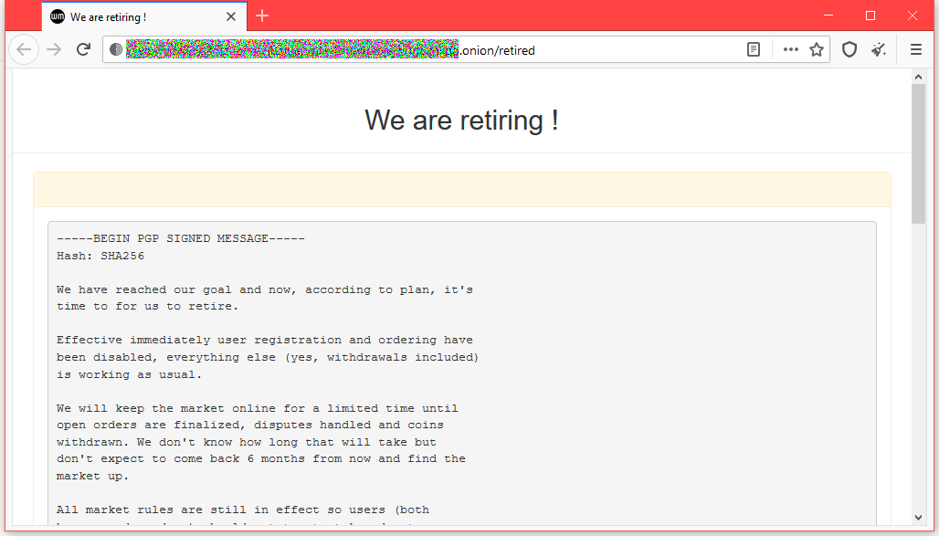 После публикации объявления, сайт, который работал по тому же принципу, что Amazon и eBay, уже отключил регистрацию новых пользователей и публикацию новых лотов. Продавцов предупредили о том, что им пора переместить свои продукты на другие маркетплейсы даркнета.
