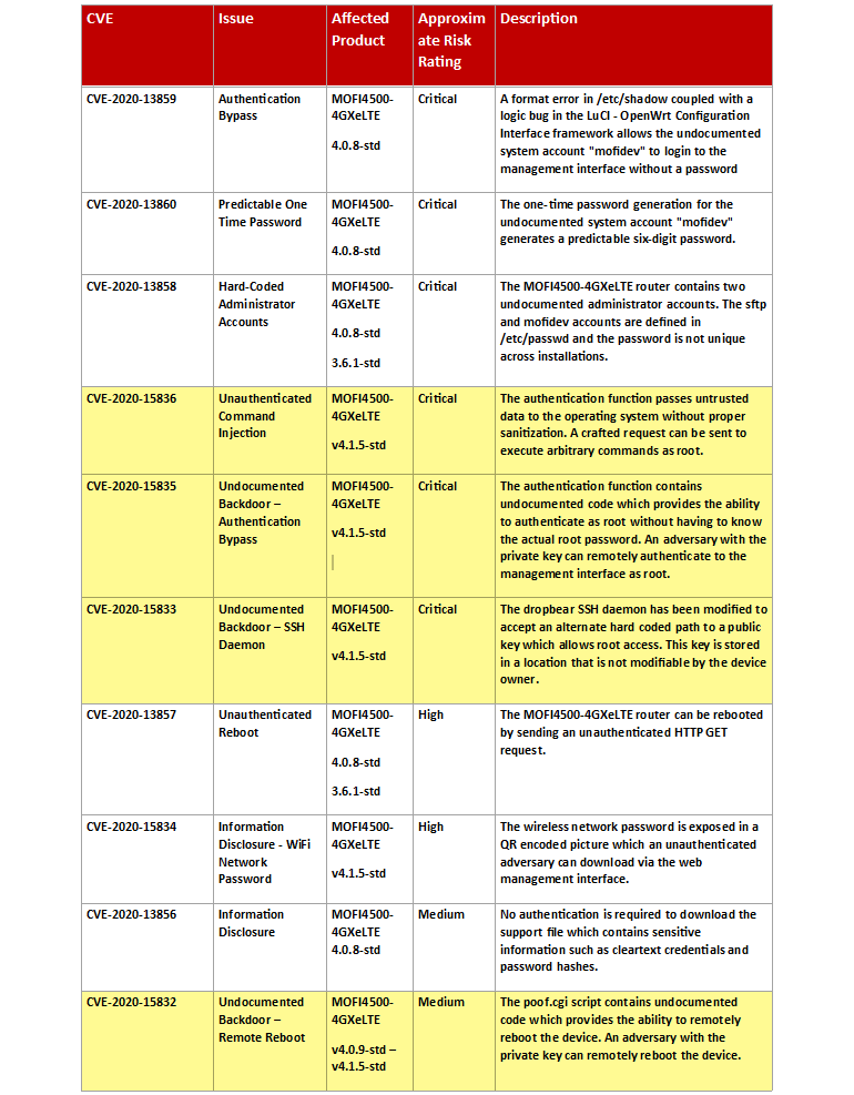 Проблемы в прошивках маршрутизаторов MoFi Network обнаружили специалисты компании CRITICAL START, которые теперь раскрыли детали уязвимостей в своем блоге, а ранее уведомили US-CERT о своих находках. Как видно в таблице ниже, большинство найденных багов относились к разряду критических, и среди них были обход аутентификации, генерация предсказуемых паролей, утечка информации и так далее. Желтым цветом обозначены проблемы, исправлений для которых по-прежнему нет. При этом компания-разработчик никак не комментирует ситуацию, то есть неясно, когда следует ожидать выхода патчей (если они появятся вообще).