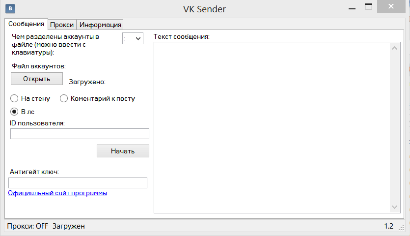 Как работает: Загружаются аккаунты, вводится ID нужного пользователя (стена и лс должны быть открыты). Вводится текст, ключ антикапчи.