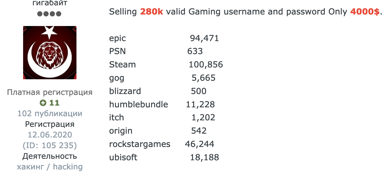 Исследователи отмечают, что внутриигровые товары и аккаунты пользуются особым спросом среди киберпреступников. Учетные данные для входа на популярные игровые платформы (например, Steam, Origin, Ubisoft или EpicGames) могут продаваться по цене от 14 долларов США за 1000 аккаунтов при оптовой продаже и до 30% от стоимости аккаунта при индивидуальной.