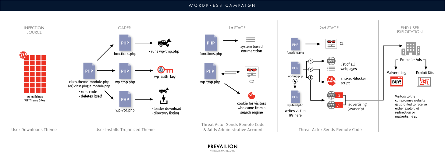 Специалисты компании Prevailion опубликовали новое исследование, посвященное методам работы ботнета WordPress-ботнета WP-VCD. Данный ботнет активен с начала 2017 года и его основная деятельность — управление сетью из 20 000 сайтов с «бесплатными загрузками», через которые распространяются пиратские коммерческие темы для WordPress. Пользователям, которые загружают такие пиратские темы, конечно же неизвестно, что те содержат бэкдор, который позволяет хак-группе WP-VCD захватывать контроль над зараженными сайтами.