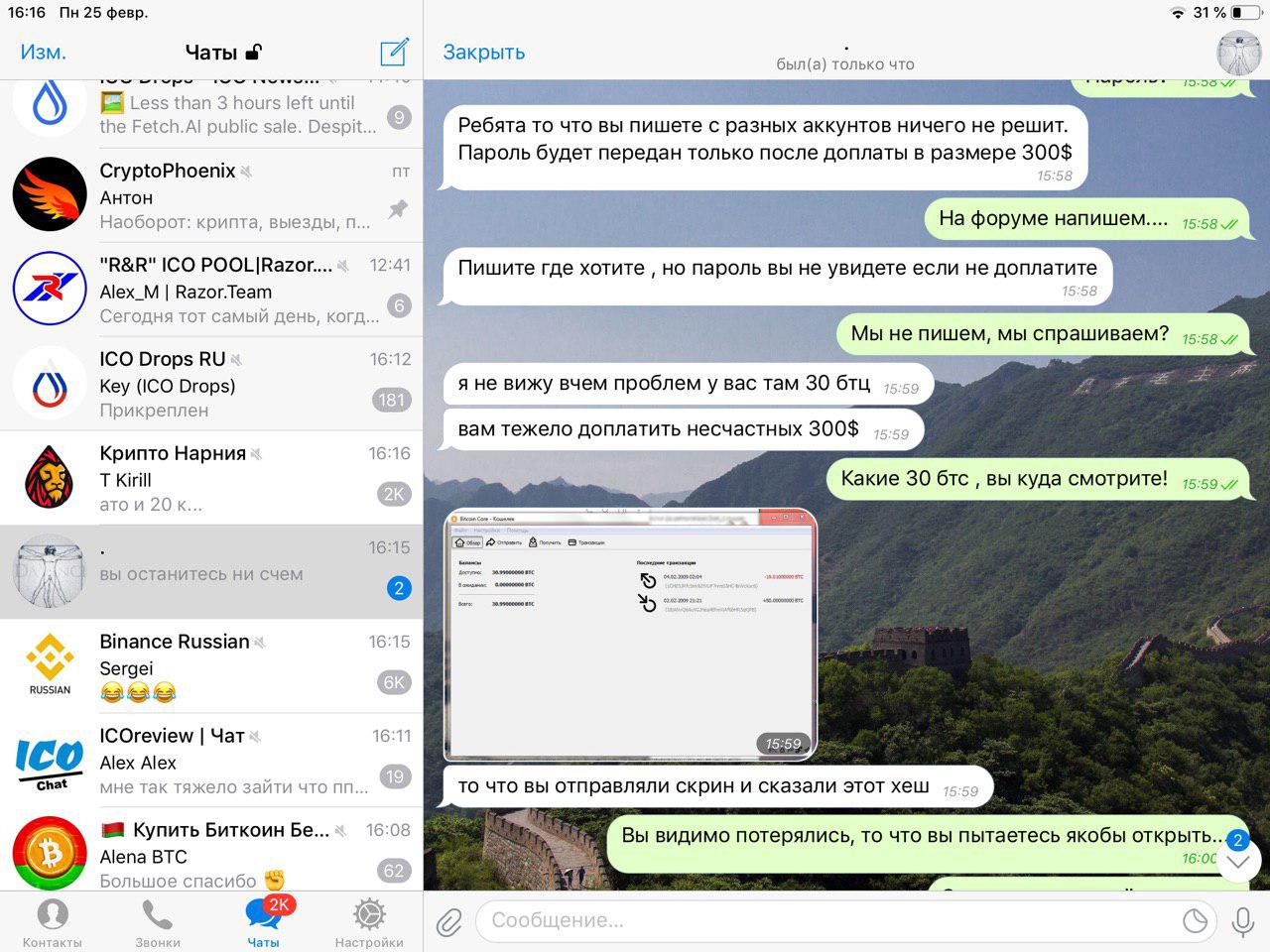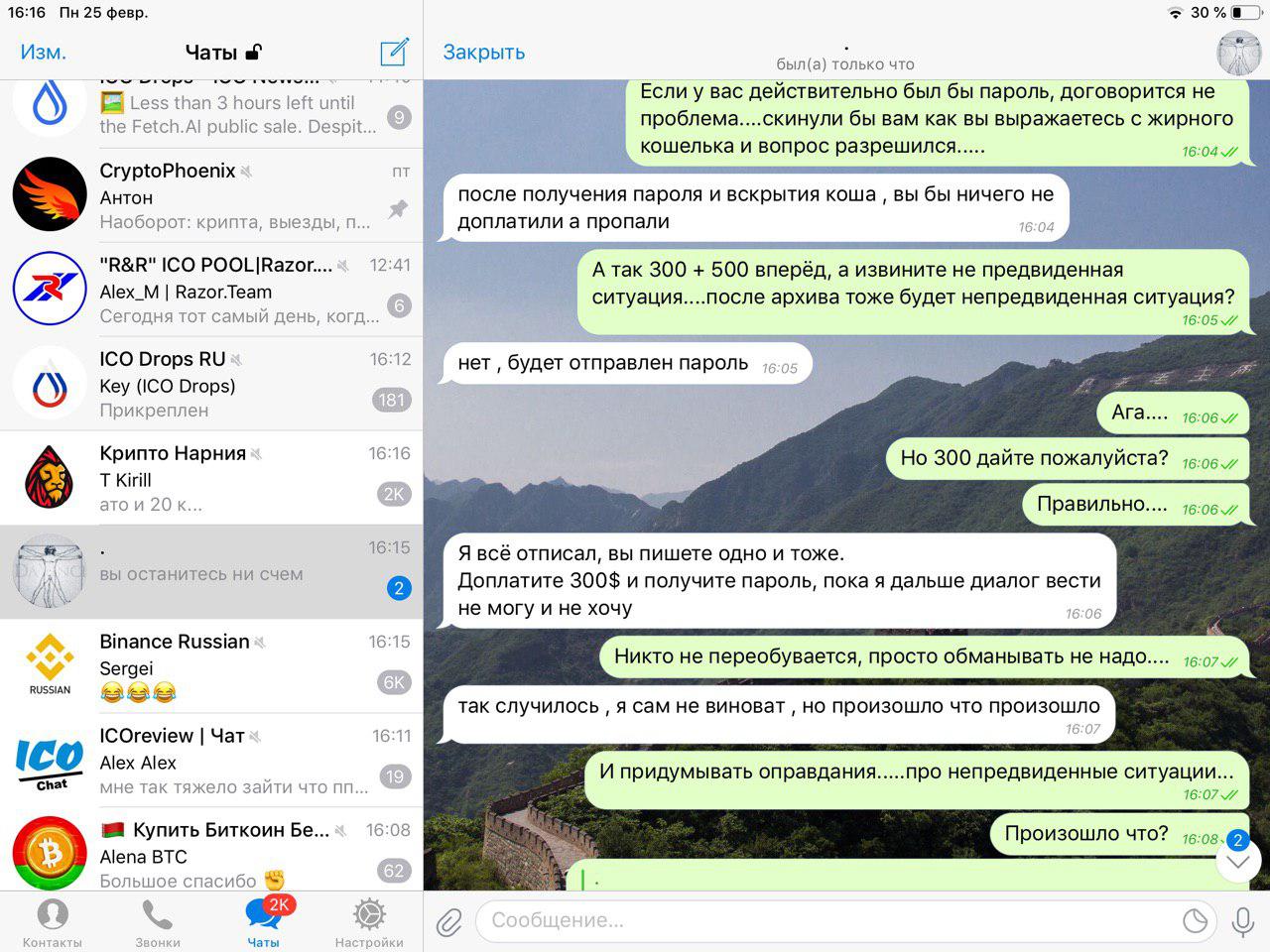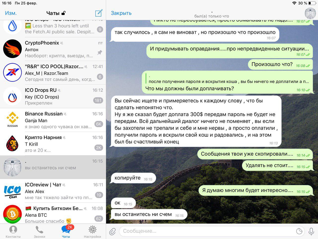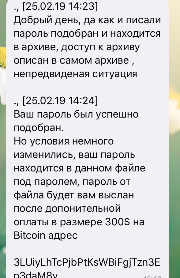 Обратились к Robert Lutece для подбора пароля к кошельку биткоин! Оплатили 532 $ с запасом вперед как и заявлено у него на странице по теме! После спустя день,присылает скрин что пароль подобран и требует еще 300 $ на запароленный архив за который и нужно заплатить еще деньги ссылаясь на непредвиденные обстоятельства!!! Заплатить мы можем,но он пытается нас обмануть,так как нет гарантии,что он нам отправит то что мы должны получить по договоренности!Поняв что у него могут быть вопросы он удалил переписку,но скрины мы сделать успели и вылаживаем на обозрение,пытались договорится на гаранта но он отказывается это делать!!!!Иконку с телеграмм какналы быстро почистил но не все.....Все платежки и переводы могу отправить в любом виде!!! По запросу предоставлю любые данные и доказательства! Все скрины в хронологическом порядке,с чего все началось и чем все закончилось....