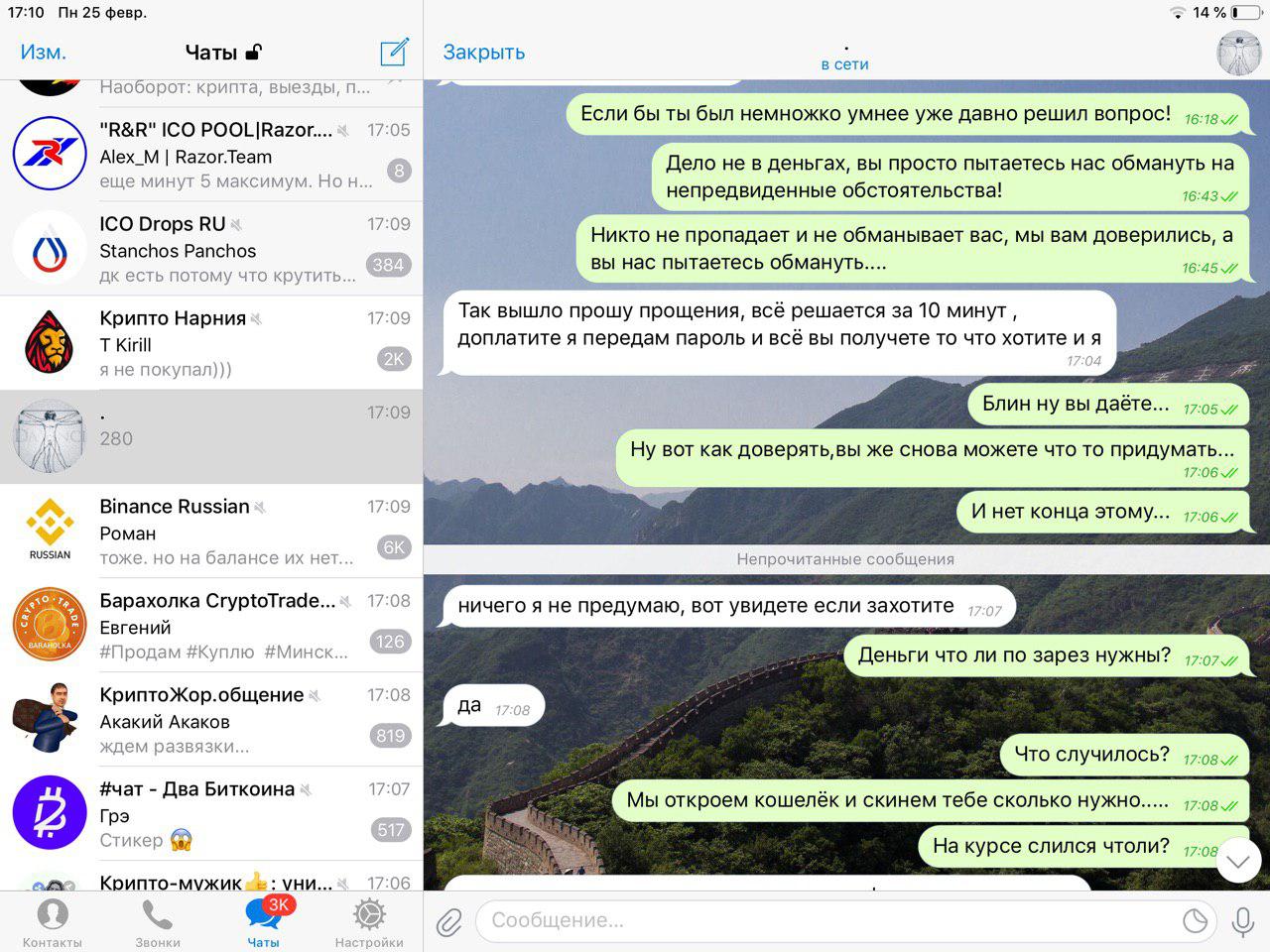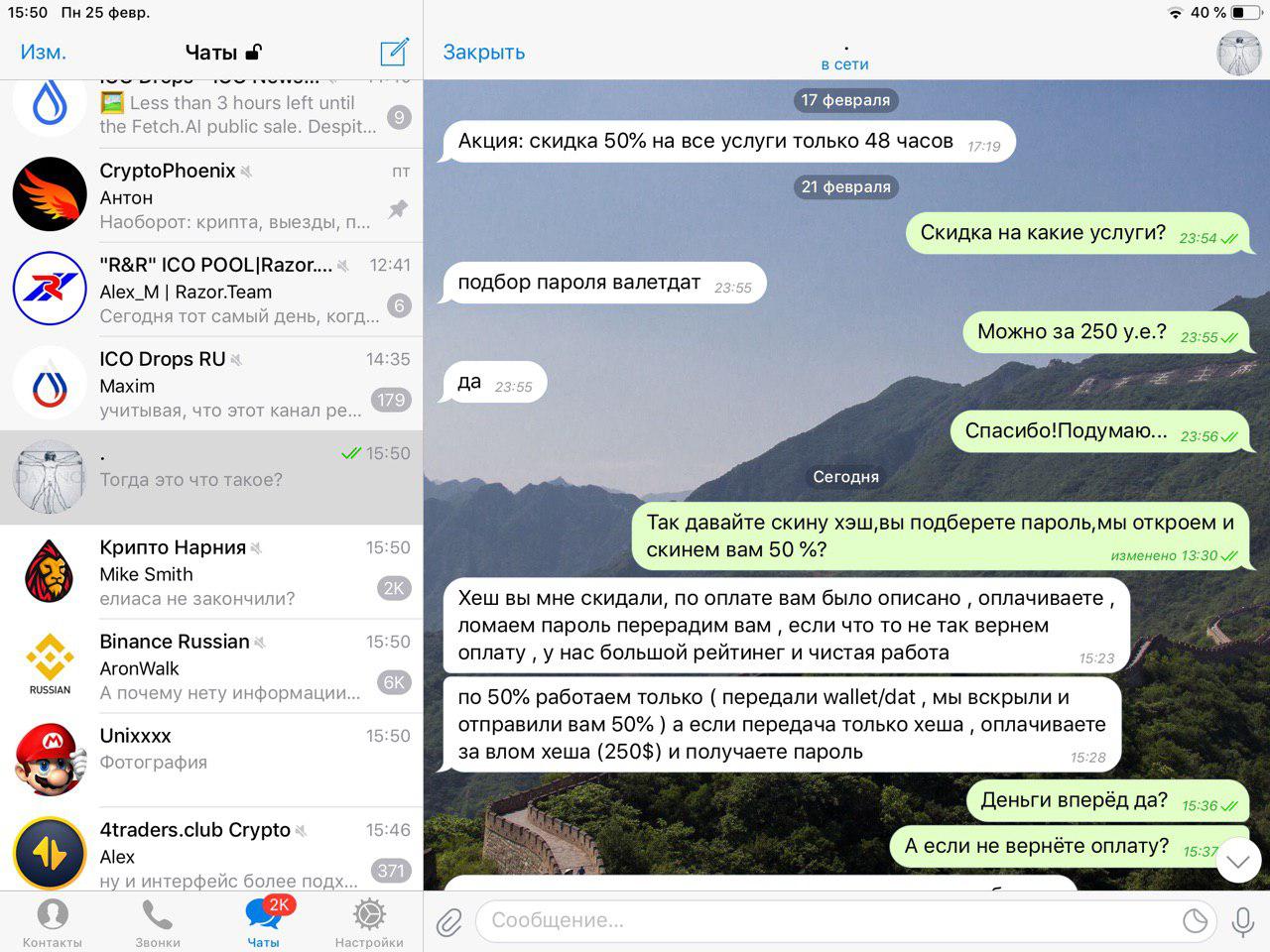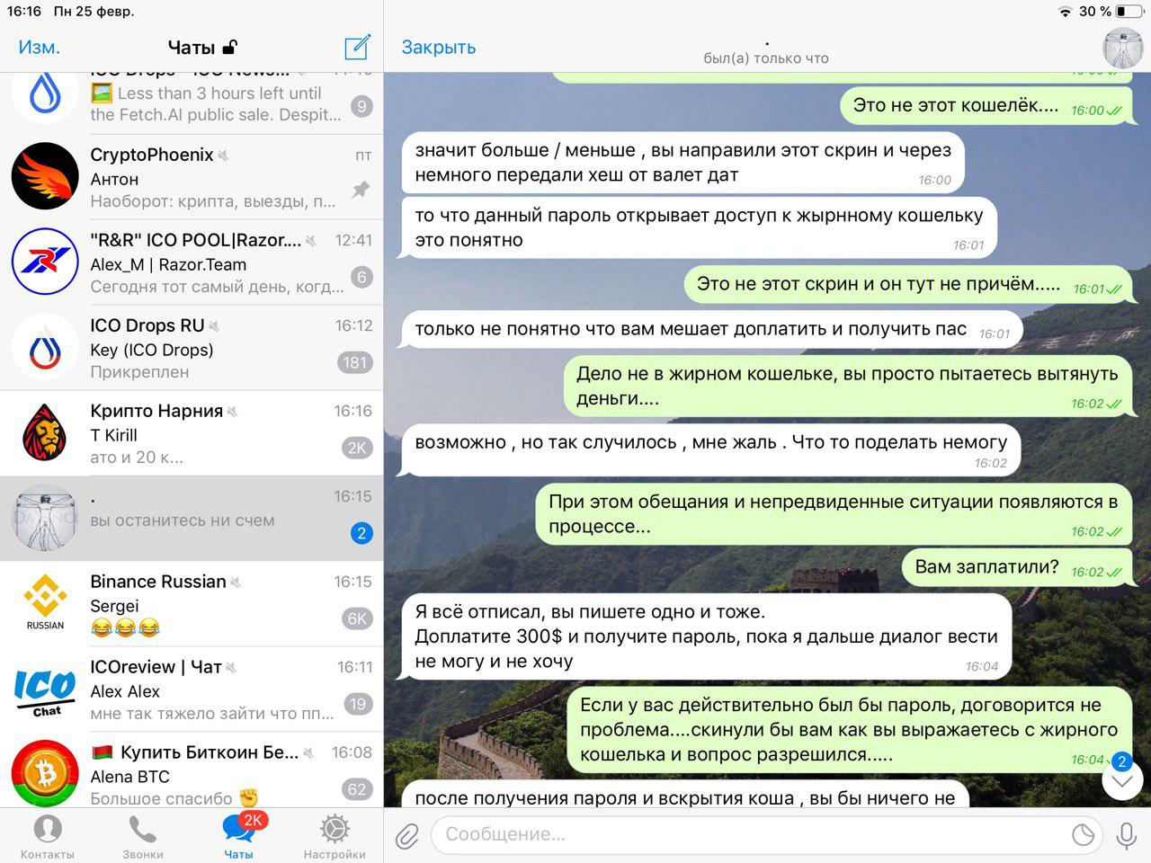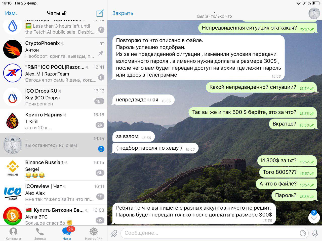 Обратились к Robert Lutece для подбора пароля к кошельку биткоин! Оплатили 532 $ с запасом вперед как и заявлено у него на странице по теме! После спустя день,присылает скрин что пароль подобран и требует еще 300 $ на запароленный архив за который и нужно заплатить еще деньги ссылаясь на непредвиденные обстоятельства!!! Заплатить мы можем,но он пытается нас обмануть,так как нет гарантии,что он нам отправит то что мы должны получить по договоренности!Поняв что у него могут быть вопросы он удалил переписку,но скрины мы сделать успели и вылаживаем на обозрение,пытались договорится на гаранта но он отказывается это делать!!!!Иконку с телеграмм какналы быстро почистил но не все.....Все платежки и переводы могу отправить в любом виде!!! По запросу предоставлю любые данные и доказательства! Все скрины в хронологическом порядке,с чего все началось и чем все закончилось....