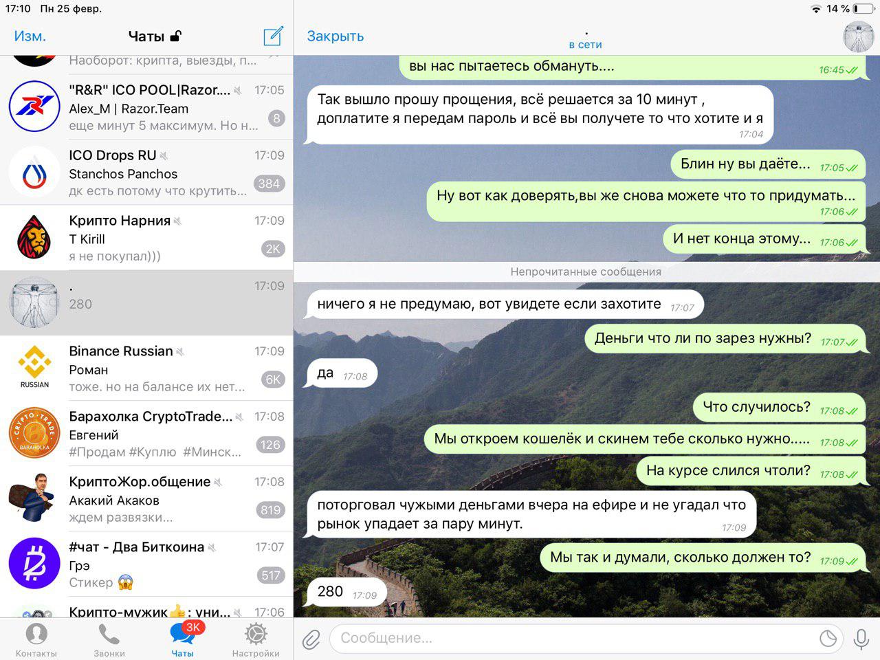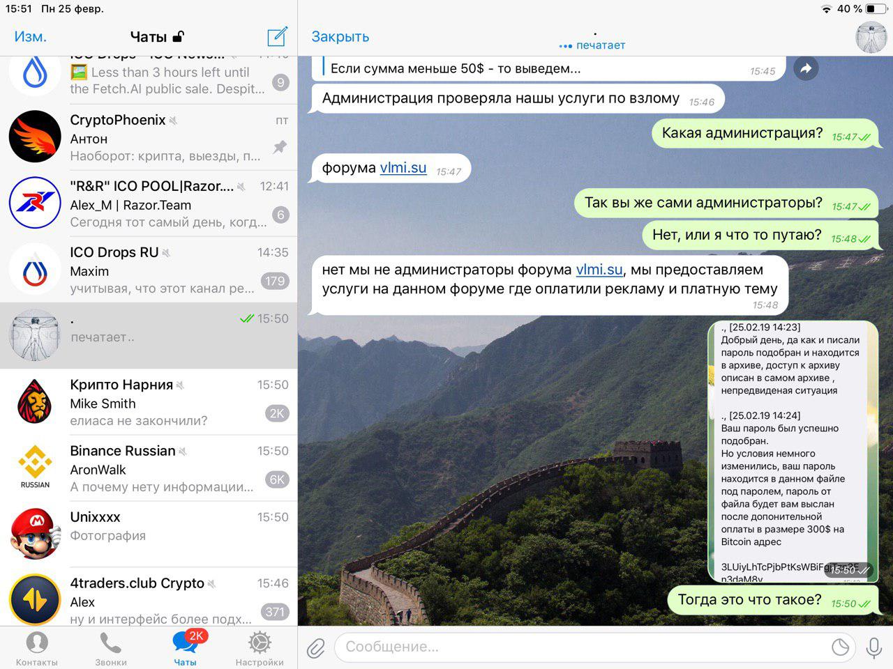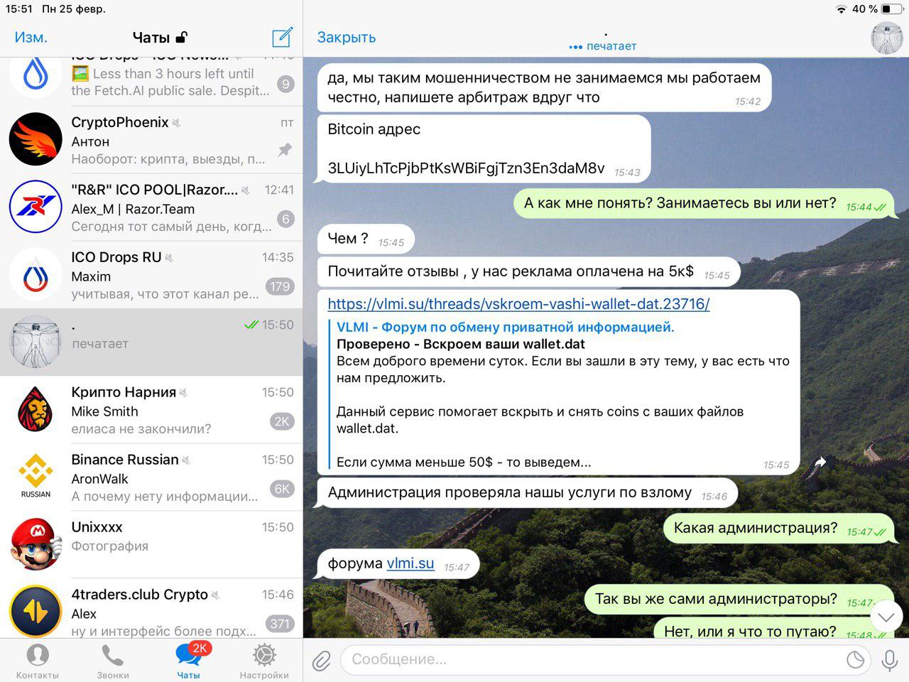 Обратились к Robert Lutece для подбора пароля к кошельку биткоин! Оплатили 532 $ с запасом вперед как и заявлено у него на странице по теме! После спустя день,присылает скрин что пароль подобран и требует еще 300 $ на запароленный архив за который и нужно заплатить еще деньги ссылаясь на непредвиденные обстоятельства!!! Заплатить мы можем,но он пытается нас обмануть,так как нет гарантии,что он нам отправит то что мы должны получить по договоренности!Поняв что у него могут быть вопросы он удалил переписку,но скрины мы сделать успели и вылаживаем на обозрение,пытались договорится на гаранта но он отказывается это делать!!!!Иконку с телеграмм какналы быстро почистил но не все.....Все платежки и переводы могу отправить в любом виде!!! По запросу предоставлю любые данные и доказательства! Все скрины в хронологическом порядке,с чего все началось и чем все закончилось....